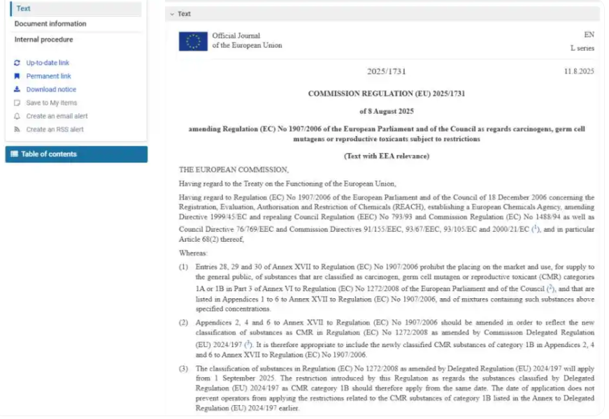 2025年8月11日,歐盟委員會在《歐盟官方公報(bào)》正式發(fā)布了新法規(guī) (EU) 2025/1731,對REACH法規(guī)附件XVII中致...
